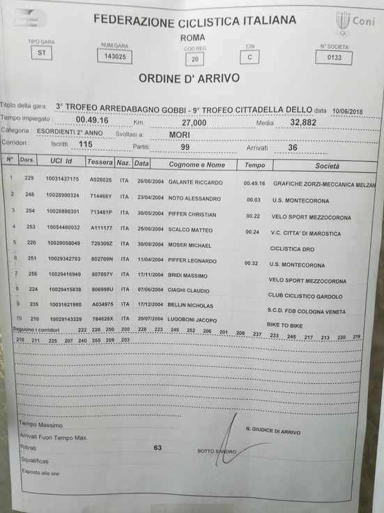 A Mori hanno gareggiato anche gli Esordienti secondo anno, anche per loro il percorso è stato sviluppato di 27 Km, i partenti erano 99 e sono arrivati al traguardo in 36. La ciclistica Dro sempre presente anche in questa classifica con Moser Michael che si è piazzato al 5° posto.