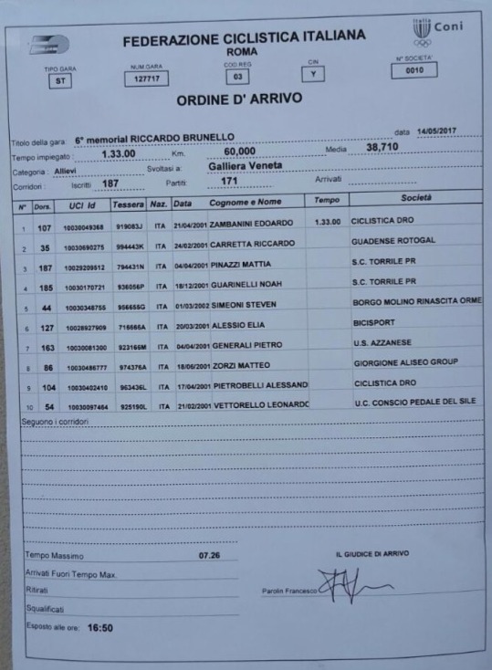 Grande vittoria anche oggi per Edoardo Zambanini che sale sul gradino più alto del podio a Galliera Veneta con Alessandro Pietrobelli al 9° posto in classifica generale.