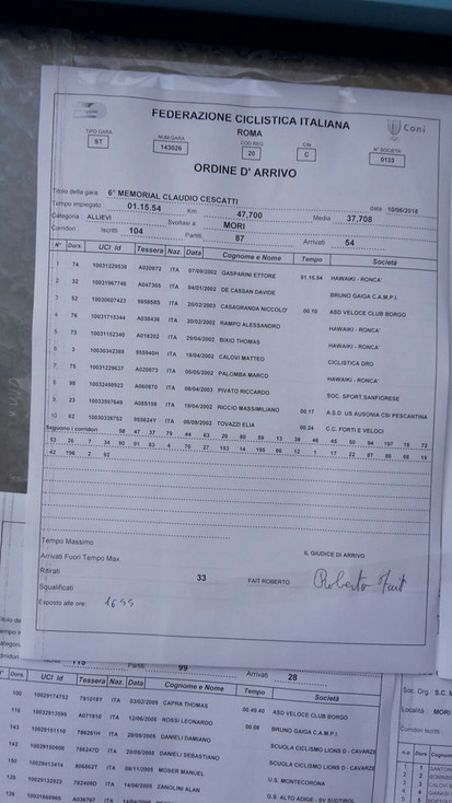 Per loro il percorso è stato di 47,700 km percorso con una media di 37,708 km e concluso con un tempo di 01.15.54. Ottima gara per i nostri ragazzi con Calovi Matteo che si aggiudica il 6° posto su 54 atleti arrivati al traguardo, i partenti erano 87.